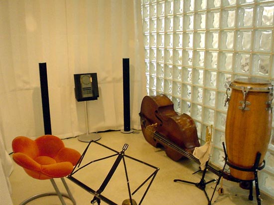 防音室とするために外部に面する窓を無くしましたが、ガラスブロックを透過する階段吹き抜けや玄関格子から入る光で、音楽室の内部は明るくなっています。