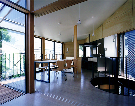 2階居間 階段を上がると、三角の敷地一杯に広がる居間があります。道路側に一杯に開いた窓からは、緑の多い俯瞰景が目に入ります。 仕上げは、床はラワン合板・天井は石膏ボードで、どちらも白系統の色で塗られています。壁はシナ合板で、柱同様、木の色をしています。