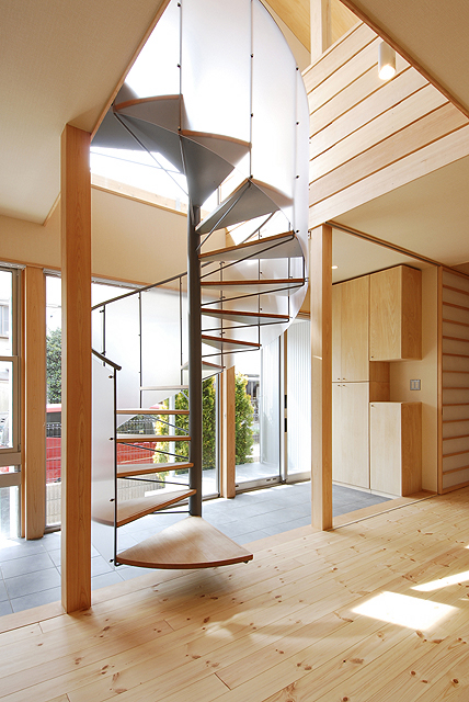 螺旋階段の周囲は大きな吹抜けとなっており、上部からの太陽光を1階に届ける役割を果たしています。また、1階と2階をつなげ、家族の生活をつなげています。