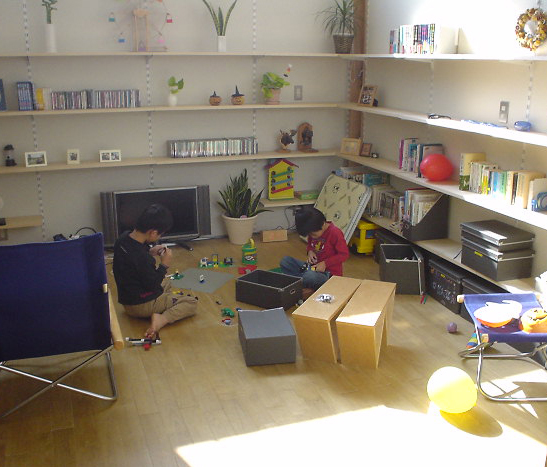 居間の壁は可動式の棚板と一体となって「収納壁」を形成しています。ここには本やCDやTVなどの他、収納ケースも置かれています。子供達がケースの一つからレゴブロックを出して遊んでいるところです。遊び終わったらケースに入れて棚の所定の場所に仕舞います。