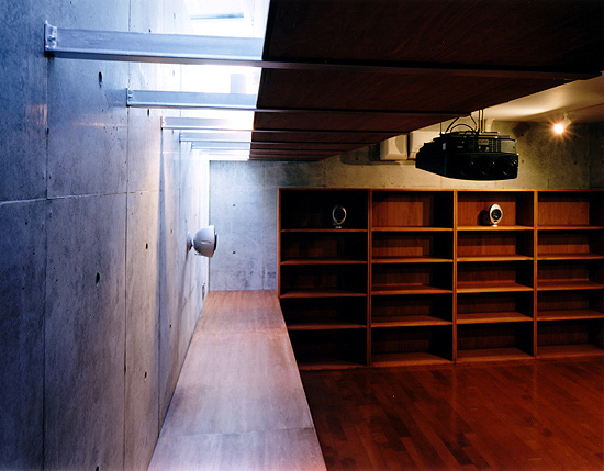 地下に設置された、設備の整ったシアタールームでは、大きなスクリーンで映像を楽しめます(天井から吊り下がっているのは3管式プロジェクター。左の壁面や正面収納内部にスピーカーが設置されている)。写真には写っていませんが、収納の反対側の壁面にスクリーンを収納した家具が設置されています。