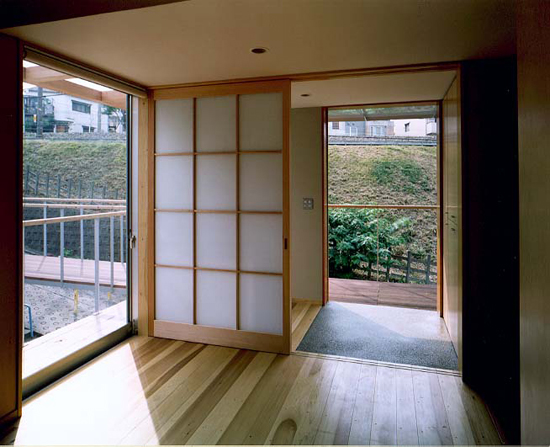 玄関の引き戸と玄関内側の障子を開けると、外部と開放的に繋がります。